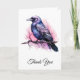 Vielen Dank Karte mit einem Bild einer schwarzen Krähe mit lila rosa Flügeln. Ein rosa Aquarell-Spritzer hinter diesem mystischen Vogel.