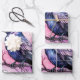 Papierblätter mit einem Bild einer schwarzen Krähe mit lila rosa Flügeln umhüllen. Ein rosa Aquarell-Spritzer hinter diesem mystischen Vogel.