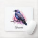 Mousepad mit einem Bild einer schwarzen Krähe mit lila rosa Flügeln. Ein rosa Aquarell-Spritzer hinter diesem mystischen Vogel.