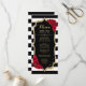 Menükarte. Klassisches Schwarz-weißes rotes Design mit Imitaten Glitzer Gold. Schwarzweißstreifen mit rote Rosen. Ideal für ein elegantes Party.