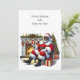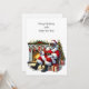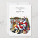 Digitale Darstellung des Schwarzen Weihnachtsmannes vor einem Kamin mit einem Baum, Geschenken und Strümpfen. Text kann angepasst oder entfernt werden, einschließlich Nachricht und Adresse Ihres Unternehmens auf der Rückseite. AI unterstützte Grafik, die mit kommerziellem Einsatz erworben wurde. Kunstwerk: DreamCafeArt