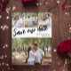 Hochzeit speichern Sie das Datum Postkarte können Sie personalisieren mit vier Ihrer eigenen Fotos, drei kleinere und eine größere. Rett, dass unser Datum diagonal über die Postkarte in einem schwarzen Skript geschrieben ist. Fügen Sie Ihre Namen und das Hochzeitstermin in einem sauberen Schriftart hinzu.