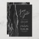 Der links Rand dieser eleganten modernen Hochzeit speichern Sie die Dattelkarte mit einem schwarzen Aquarellrahmen in Aquarellfarbe, der mit Imitaten silbernen Glitzer bestickt ist. Der anpassbare Text kombiniert silbergraues Skript und singt Serif-Schriftart auf schwarzem Hintergrund. Auf der Rückseite ist ein passendes schwarz-silberfarbenes Design erkennbar.