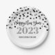 Anpassbare glückliche neue Jahr 2023 Teller in glamourösen silber-schwarzen Konfetti-Muster und eleganten handgeschriebenen Stil Text.