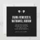 Zwei Schädel teilen das Aussehen der Liebe auf dieser schwarzen Hochzeit speichern Sie das Datum. Wenn Sie Hexe, Zauberer, Piraten, Got oder einfach nur eine Person der Nacht sind und keine Angst vor der Dunkelheit haben, ist diese Einladung für Sie. Texturale Schriftart und ein einfaches und sauberes Layout machen die Namen des Paares zum Fokus und leicht zu bearbeiten Text leitet Gäste auf eine Website für mehr Informationen über die Hochzeit und relevante Veranstaltungen.