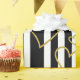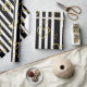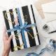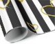 Bold black and white stripe pattern wrapping paper accented with luxe gold-style hearts for a chic, romantic look. A high-contrast design with a modern glam mood.