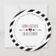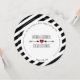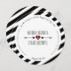 Eine runde Hochzeitseinladung mit einem Hintergrund aus schwarz-weiß Streifen. Personalisieren Sie den schwarzen Text an den Kanten mit Details zu Ihrem Anlass. Personalisieren Sie sich mit den Namen von Braut und Bräutigam in der Mitte mit rotem Herz und Pfeilen.