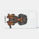 Desteis originelle Cartoon-Illustration einer niedlich sitzenden schwarzen und bräunlichen Farbe Cavalier King Charles Spaniel züchten Hund. Es gibt auch einen personalisierbaren Textbereich für benutzerdefinierten Text. Der Hintergrund weist ein Muster grauer Hundepfoten auf.