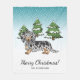Desteis originelle Cartoon-Illustration einer bezaubernden langen Haar schwarz und tan Daple Fell Farbe Dackel züchten Hund. Der Hund ist in einer Winterlandschaft mit drei grünen Tannenbäumen und fallendem Schnee untergebracht. Der Hintergrund ist ein blaues bis weißes Gefälle, das das Design des kalten Wintertages verleiht. Es gibt auch einen personalisierbaren Textbereich, der jetzt "Frohe Weihnachten!" in einem schönen Script-Schriftart liest. Darunter befindet sich ein weiterer personalisierbarer Textbereich für einen Familiennamen oder einen anderen benutzerdefinierten Text.