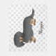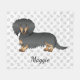 Desteis originelle Cartoon-Illustration einer niedlichen langen Haar schwarz und tan Fell Farbe Dackel züchten Hund. Der Hintergrund weist ein Muster grauer Hundepfoten auf. Es gibt auch einen personalisierbaren Textbereich für einen Namen.