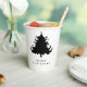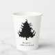 Merry Christmas paper cups in black and white. Pine tree with swirling branches in black is the image on front and back. Customize with text that also prints on both sides, beneath the tree design.