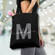 Personalisierte elegante Black Trendy Moderne Skriptname Monogram Tote Bag. Mit dieser schicken Tasche können Sie Ihren Alltag mit einer Touch an Eleganz bereichern. Diese Tasche mit einem schlichten, grauen, auf einem knusprigen schwarzen Hintergrund zentrierten Erststück und einem sauberen und modernen Design auf beiden Seiten verbindet Eleganz mit Praxisnähe. Diese Tasche eignet sich ideal für alle, die das Wesentliche zum Arbeiten, zur Schule oder zum Ausgehen mitbringen möchten. Sie ist ideal für Geschäftsleute, Studenten oder alle, die stilvolle und funktionelle Accessoires schätzen. Es ist ein nachdenkliches Geschenk für Geburtstage, Feiertage, Muttertag oder jeden besondere Anlass. Eine polierte und praktische Ergänzung zu Ihren Alltagserfahrungen.