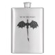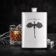 Ein schwarzer Stammesdrache fliegt mit komplett ausgebreiteten Flügeln, schlank und symmetrisch. Von oben gesehen, seine langen, spitzen Schwanz und gekrümmten Flügel scharf gegen alle Silber schneiden. Eine kühne Silhouette des Powers und der Gnade. Eine von oben nach unten gerichtete Ansicht eines schwarzen Stammesdrachen in der Flucht.