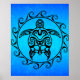 Schwarzes Stamm Polynesisches Tätowierdesign in der Mitte eines Maori Sonnensymbol mit ozeanblauem Hintergrund.