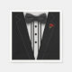 Ein schwarzer Smoking mit einer Krawatte und einer rote Rose.