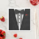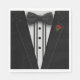 Ein schwarzer Smoking mit einer roten Krawatte.