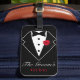 Gepäckanhänger mit schwarzer Krawatte getuxedo und rote Rose corsage. Persönlich mit dem Namen des Bräutigams für ein Junggesellenwochenende oder einen Flitterwochenurlaub. Die Gepäckmarke ist ideal, um Ihre Gepäcktasche im Gepäckwagen des Flughafens zu finden.