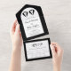 Black and white tuxedo Mr and Mr two grooms gay All in One wedding Invitation. This elegant wedding invitation features a sophisticated black and white design, specifically tailored for a Mr & Mr gay wedding. The primary visual element thoughtfully showcases the upper portion of two gentlemen's formal suits, complete with distinguished bow ties, indicating the attire of the two grooms. The names of the grooms are in script typography. All elements are placed in a white arch with black border. This clear and cohesive design effectively conveys the joyous union and the formal, yet personal, tone of the event.