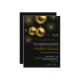 Black wedding invitation with gold text and glittering ornaments. Fireworks and baubles convey a festive New Year’s Eve theme. Elegant and celebratory.