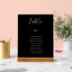 Black and white wedding table number card with guest names seating chart
