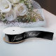 Ein einfaches schwarzes Band für eine Hochzeit. Es kann benutzt werden, um das Auto oder den Strauß der Braut zu dekorieren. Es hat die Namen der Braut und des Bräutigams in einer weißen eleganten Kalligraphie geschrieben.