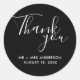 Gastgeschenk Hochzeit Aufkleber in Schwarz-Weiß. Danken Sie Ihren Hochzeitsgästen mit diesen personalisierten Hochzeitsaufklebern in einem wunderschönen Script-Schriftart, der lautet: Danke. Personalisieren Sie mit Ihren Namen und Hochzeitstermin.