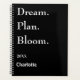 A black colored background, white text. The motivational quote: Drem. Plan. Bloom. Personalize and add your name and year.