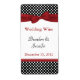 Elegante Hochzeitsweinetiketten für Sie bereit, um mit Ihren eigenen Informationen zu personalisieren. Hübsche Grafik mit schwarz-weißem Polka-Punktmuster, oben und unten auf dem Etikett, mit weißem Text. Die Grafiken eines roten Schleifens und Bogens schmücken die Oberseite des Textbereichs, und ein rot-weißes Band schmückt den unteren Rand des Textbereichs. Personalisieren Sie den schwarzen und roten Text, um Ihre Hochzeitsbedürfnisse Anzug. Ideal für Ihre kleinen Geschenkweine, Champagner und Zuhause-Weine für Ihre Hochzeitsgäste.