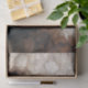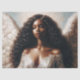This tissue paper features a beautiful black woman angel looking introspective. She has very long, thick wavy hair and large white feathered wings, wearing an off-the-shoulder white gown. Her expression is calm as she looks off to the side.