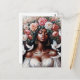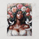 This floral postcard features a hyperfeminine artwork of a gorgeous black woman adorned by large, blooming flowers and surrounded by doves. Her eyes are closed in a serene expression, and she wears a peasant-style white dress. The melanin-rich dark brown-skinned beauty could be African-American, Afro-Latina, Caribbean, Afro-British, etc.