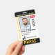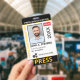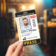 Medium sized 3"x5" vertical press ID with eye-catching yellow as the accent color. Add photo, your news publication logo, the reporter's name, title, the badge ID number and more. This Press ID is in a slightly larger size for easy visibility. Add your QR code to the back as well.