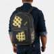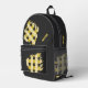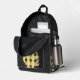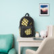 Two-tone black and yellow. Checkered appliqués on a black backpack. Add your name to the front and your text to the right and along the zipper. Alternatively, you can change the appliqué designs to your own images or pattern.