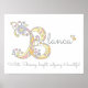 Hübsches B-Monogramm-Artenposter, ideal für ein Mädchenschlafzimmer oder ein Spielzimmer in Grautönen, Weiß, Gelb, Rosa und lila. Personalisieren Sie mit dem eigenen kurzen Namen Ihres Kindes, beginnend mit B, und Name für eine wirklich personalisierte Touch für das Kinderzimmer oder Kinderzimmer, dieses Beispiel ist für den Namen B Blanca White. Schön, hell, aufregend und schön. Niedlicher Plakatdruck ideal für ein neues Baby-, Taufen- oder Babyduschgeschenk. © Einzigartiger Buchstabe B Mongramm Herz und Blume, zeichnend und Grafikdesign von Sarah Trett. www.sarahtrett.com für www.mylittleeden.com