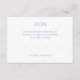 Geben Sie dieser Karte Ihre persönliche Touch. Diese chic Kleidungskarte verfügt über 5 leere Punkte, die Sie per Hand füllen können, indem Sie Wasserfarbe oder ein anderes Medium verwenden. Die Vorderseite ist mit einem zeitgenössischen Schriftart in staubblauer Farbe mit weißem Hintergrund versehen, während auf der Rückseite ein weißes, blumenfarbenes Monogramm mit einem staubblauen Hintergrund angebracht ist. Dieser Artikel ist Teil einer Hochzeitssuite, die Einladungen und andere Produkte beinhaltet.