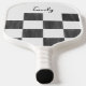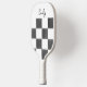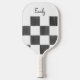 This pretty pickleball paddle is ready to be personalized with a name in black script style lettering. The paddle has a pattern of painted black squares and plain white squares arranged in a checkerboard pattern. The pattern appears on both sides with the name on one side of the paddle.