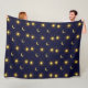 Front view: Blanket with deep blue background featuring a repeating pattern of yellow suns and crescent moons. Back view: Plain white fabric.