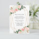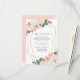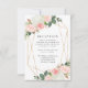 Stilvolle, elegante Hochzeitskarten mit ihren Details an der Hochzeitsfeier, umgeben von einem geometrischen Rahmen in goldenen Imitaten mit Bouquets von blau-rosa Rose und Tulpen mit üppig grünen und kupferfarbenen Blätter. Personalisieren Sie die Karte, indem Sie wichtige Informationen wie die Position des Empfangs, die Zeiten usw. hinzufügen.