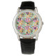 Die Armbanduhr hat ein geometrisches Design aus drei Kreisen, die zusammengeschweißt und in verschiedenen Farben über das Design verteilt sind.