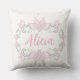 Ein weißes Kissen, das super feminin ist, mit einem rosa Blumenmuster geblüht Emblem-Design auf dem Kissen mit der Fähigkeit, Ihren Namen oder Ihr Geschäft darauf anpassen.