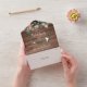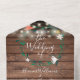 Alles in einer Hochzeitseinladung mit hübschem Blumengarten, Streichelleuchten, prächtigen Stilbezeichnungen und Monogramm und schicker Typografie auf rustikalem Holzfußboden. Die Einladung enthält eine perforierte RSVP-Karte, die für Sie individuell adressiert oder links als leere Adresse für die Handschrift der Adressdaten Ihres Gastes verwendet werden kann. Entwickelt von Thisisnotme©