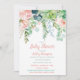 Rosa Aquarellfarben Blume und Grünpflanzen für eine Mädchen Baby Dusche Einladung. Es hat einen koordinierenden Hintergrund und macht die perfekte Babydusche-Einladung für Mama.