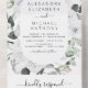 Weiße Rose mit Blumen und Eukalyptus Botanische Vegetation Watercolor Hochzeitsfrühling oder Sommerhochzeiten Einladungen - inkludiert schöne und elegante Schrift-Typografie mit modernen tropischen botanischen Blume und Grün für die besondere Hochzeitsfeier.