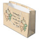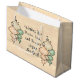 Diese ganz besondere Weihnachtsgeschenktasche hat ein elegantes, feminines, Edwardian-Ära-Gefühl. Mit einem originellen Design von Leslie Sigal Javorek, w/ group of 3 squiggly blown Glas Ornamente auf einem blassen Pfirsiche & Creme Damask Hintergrund. Sie können die Vorgabe behalten, ändern oder löschen: "Wir wünschen Ihnen Frieden, Liebe und ein frohes neues Jahr!".