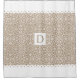 Weiße und blassfarbene Taupe-Damast-Muster mit weißen, geschmolzenen Rändern und monogramm Duschvorhang. Auf der oberen und unteren Seite des Vorhangs sind weiße Bänder mit geschliffenen Kanten, in der Mitte befindet sich das Monogramm in einem weißen Rahmen. Sie können es mit Ihrem Namen personalisieren.