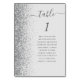 Der links Rand dieser eleganten modernen Hochzeitskarte weist eine silberne Imitat-Glitzer-Grenze auf. Das Wort "Tabelle" erscheint in der handgeschriebenen Schreibschrift in Holzkohle grau auf einem hellgrauen Hintergrund. Fügen Sie die Namen Ihrer Gäste hinzu, die jeder Tabelle zugeordnet sind.