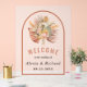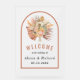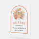 Entwerfen Sie ein wunderschönes, mattiertes Begrüßungsschild aus Acryl, das einen tropischen Flair mit Blätter aus getrockneten Palmen, Pampas-Gras und Protea-Blume in hübschen Terrakotta-Rosa- und Beige-Tönen aufweist. Der in Terrakotta gehaltene Bogenrahmen hebt die lebhaften Farbtöne der botanischen Akzente perfekt ab. Diese besondere Mischung von Texturen und Farben wird zweifellos als atemberaubender Brennpunkt für jede Hochzeitsfeier dienen.