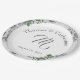 Das Design der weißen Spitzen- und Rose-Blätter zeigt die Namen von Paaren in elegantem silbernen Text, der als Bogen gegen eine weiße Unterlage dargestellt wird. Hintergrund zeigt das Bild von weißer Spitze. Im Zentrum wird der erste Nachname des Paares angezeigt. Das Hochzeitdatum wird unten angezeigt. Die Blätter der grünen Rose sind an den Kanten empfindlich positioniert.