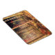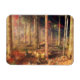 Sonnenstrahlen im Herbst blicken durch die Gelb- und Rotholzbäume am Waldrand und erhellen die gefallenen Blätter auf dem Waldboden. Tiefer im Wald, wo die Schatten dunkler sind, gibt es immer noch Einblicke in Gold und Crimson.