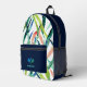Aquarellfarben Blätter Modernes Monogramm Pickleball Bedruckter Rucksack Ein benutzerdefiniertes Design auf einem abstrakten, grünen und roten Hintergrund mit einer Pickleball-Abbildung, die durch das Hochladen Ihres eigenen Logos, Bildes oder Motivs leicht ersetzt werden kann. Der personalisierte Monogrammname in der modernen blauen Blocktypografie kann durch Ihren eigenen Namen oder benutzerdefinierten Text ersetzt werden. Die Vorderseite ist in einer schicken marineblauen Farbe. Das perfekte Geschenk oder Accessoire!