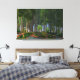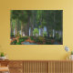 Ein Baumstand an einem sonnigen Sommertag. Die hohen Bäume sind groß und dunkel, aber die darunter liegenden Splint haben ein helles neues Wachstum. Durch die gefallenen Blätter wachsen die grünen und rosa und weißen Klee und andere Bodenabdeckungen auf.